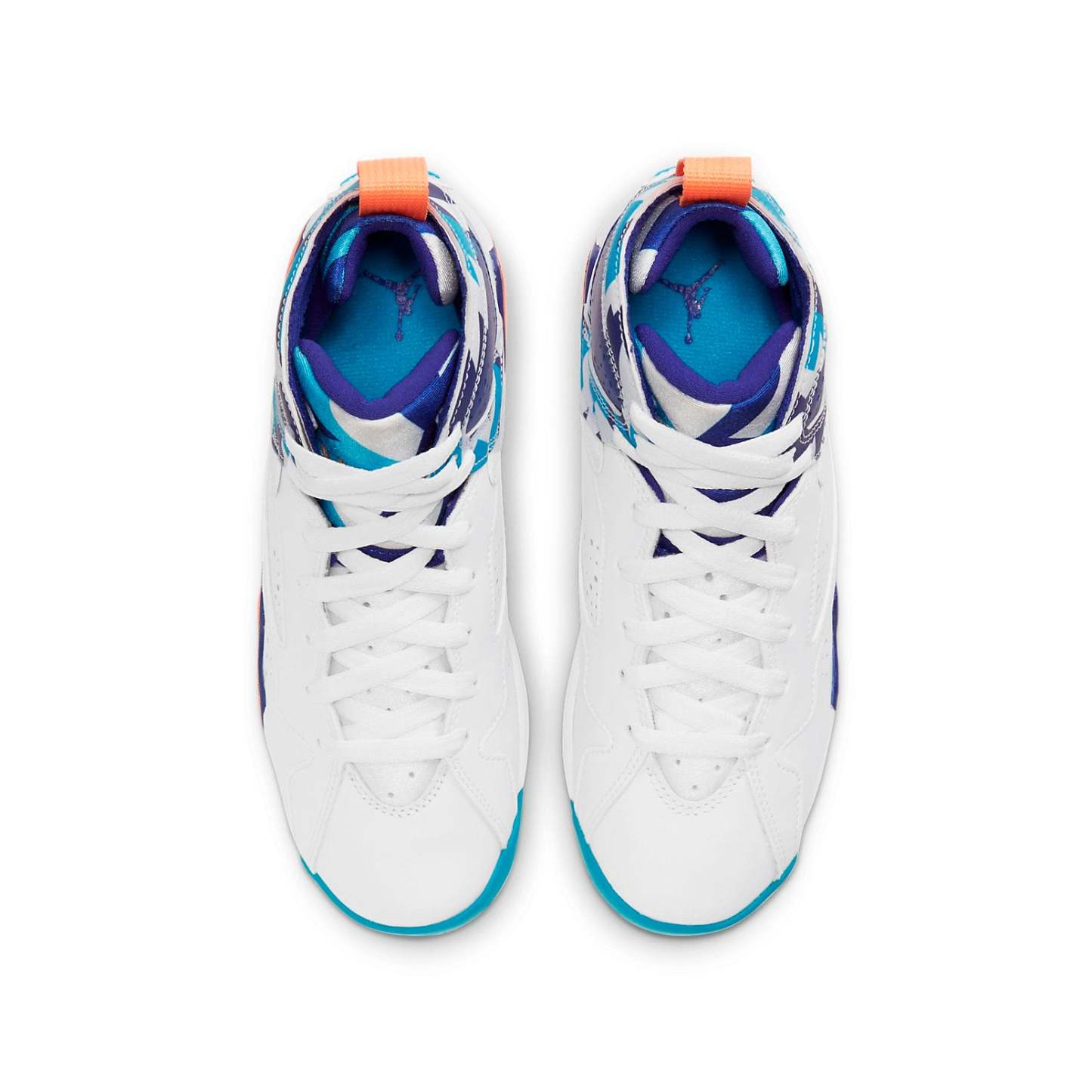 This Air Jordan 7 GS “Chlorine Blue” is dressed in a white leather upper and adds the signature tribal-themed pattern on the Huarache-inspired ankle, colored in with chlorine blue, a bright mango, and a navy hue. Lastly, a tribal-themed pattern on the tongue, ankle collar, and inner heel completed the design. SKU: 442960-100 Release Date: Jan 2021 Color: White/White-Chlorine Blue