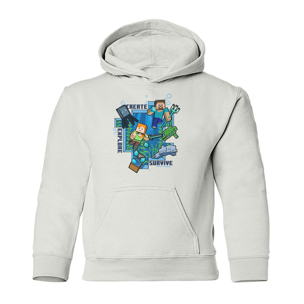 Your little gamer will love creating, exploring, and surviving in the Minecraft world while wearing this Minecraft Caves & Cliffs Create, Explore, Survive Kids Hooded Sweatshirt. Featuring an array of Minecraft Caves & Cliffs characters, this hoodie will become a favorite look for any Minecraft fan.